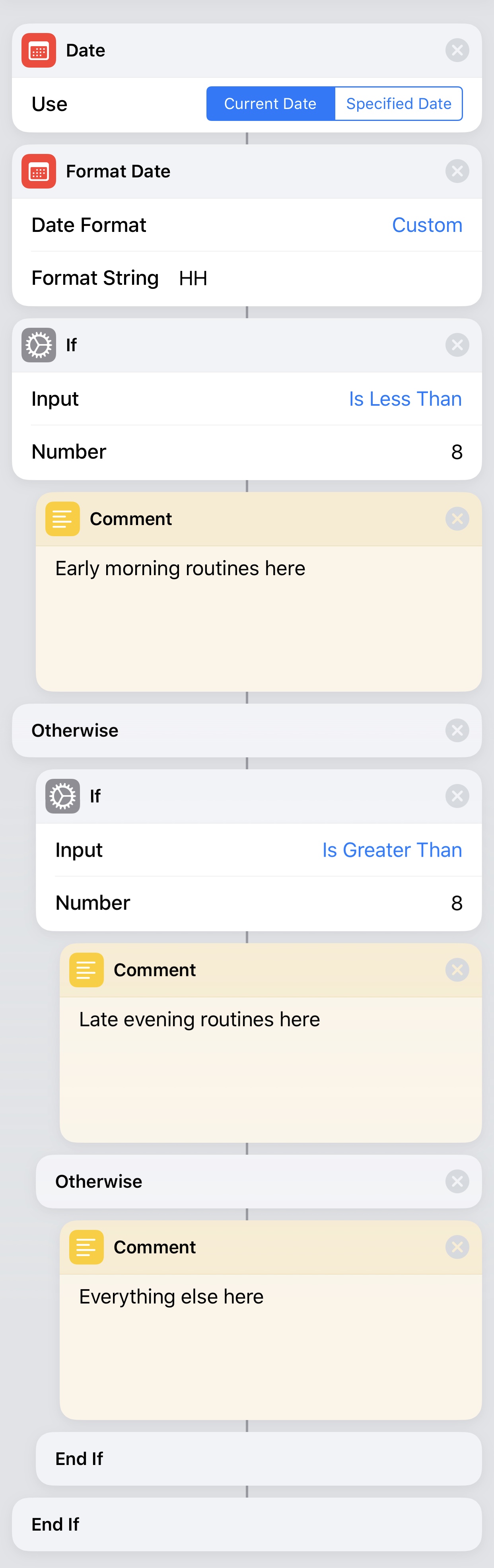One of the examples Shortcuts I talked about was my Home shortcut, this lets me choose from different scenes at different times of day - something you may want to incorporate into other Shortcuts, here's how it works: