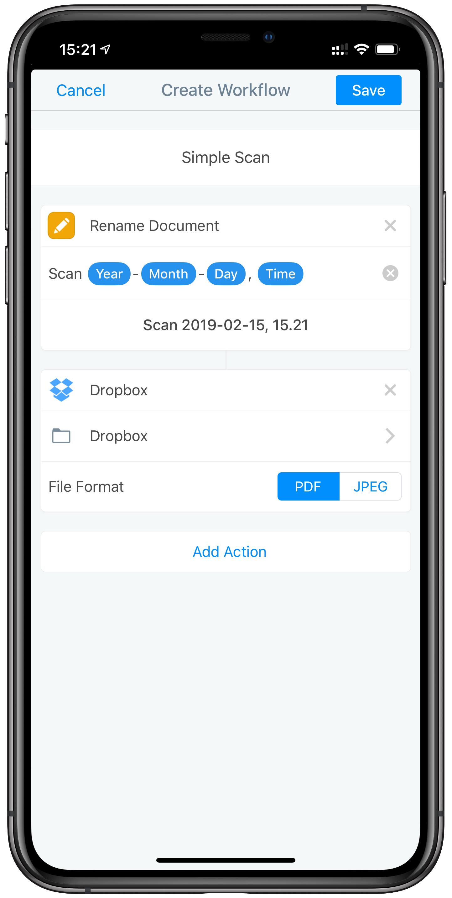 Scanner Pro is an app David and I both use to scan documents on the go - as well as when we're on the road. It has built-in OCR, and Workflows which allow you to chain multiple actions together. Most of the time I use a Workflow called "Simple Scan" which formats the name to Scan Year-Month-Day, Time and saves the document as a PDF to Dropbox. I usually save to a specific folder in Dropbox which Hazel then watches and automatically files certain things or me.