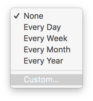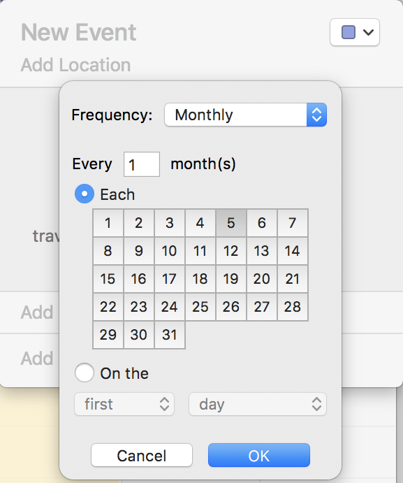 Of course, one of the simplest ways to automate calendar event creation is repeats - and you can go from very simple up to fairly complex within that. The simplest repeats are every day/week/month/year, but if you go into the Custom... options then you can create repeats such as "On the first weekday of every month".