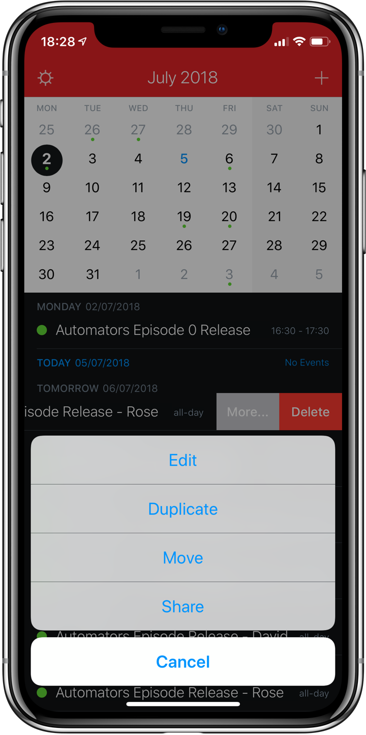 CMD+Cand thenCMD+Vlets you paste, if you select a new date before you paste then the event is automatically added to that day. In many apps you can even paste it in at the time you have selected. - Fantastical on iOS gives you the option to duplicate an event when you tap and hold on it, or when you swipe, and tap "More...", BusyCal allows you to duplicate an event by force touching it. I personally prefer Fantastical as it immediately asks me for the new date where as with BusyCal you need to edit the new event.