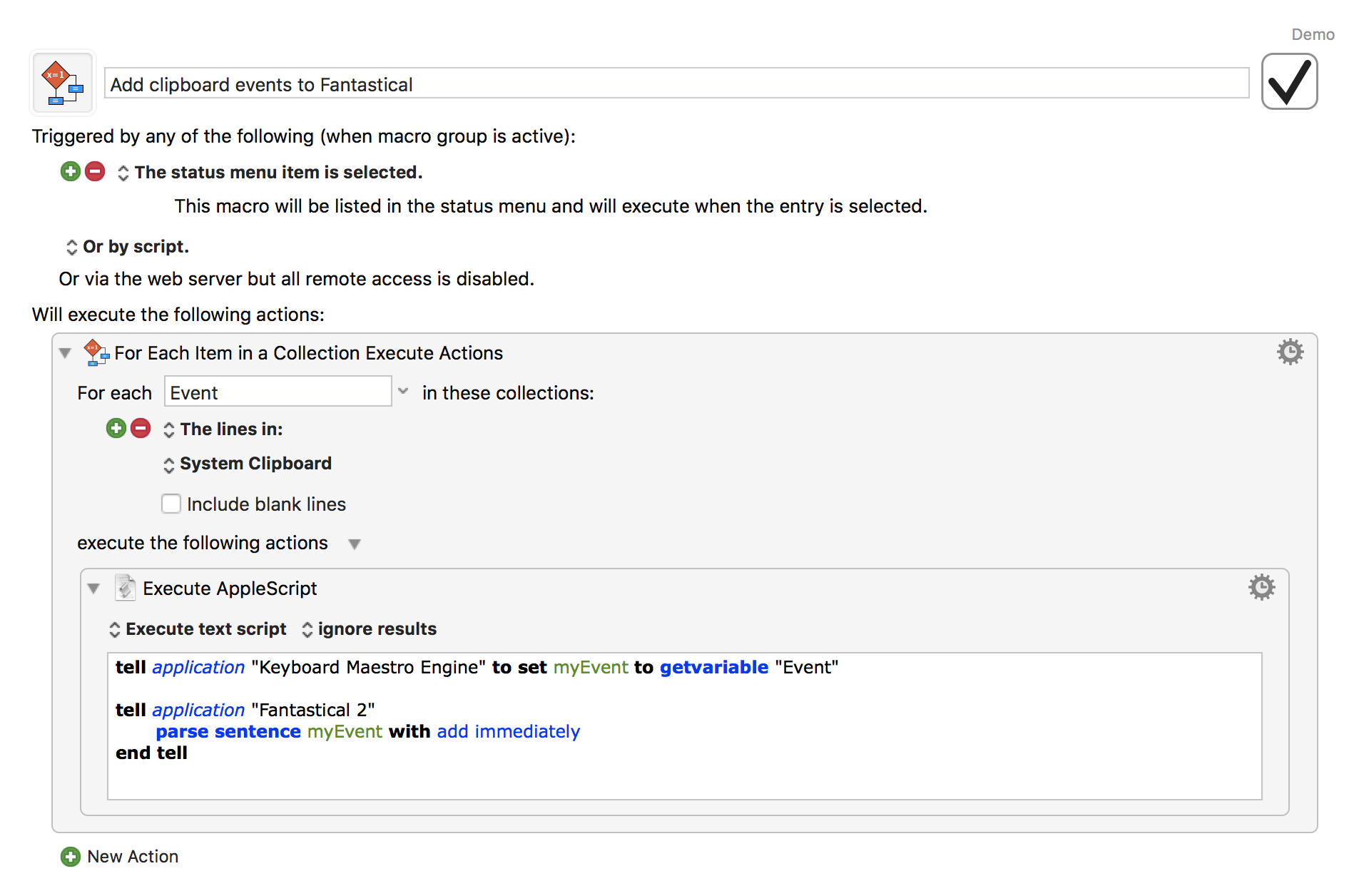 end tell This AppleScript merely sets a local variable to the Keyboard Maestro variable for the line, and then uses Fantastical's AppleScript support to get it to parse the event and add it straight to your calendar. If you wanted to evaluate each event before it gets added then you would remove the with add immediately.