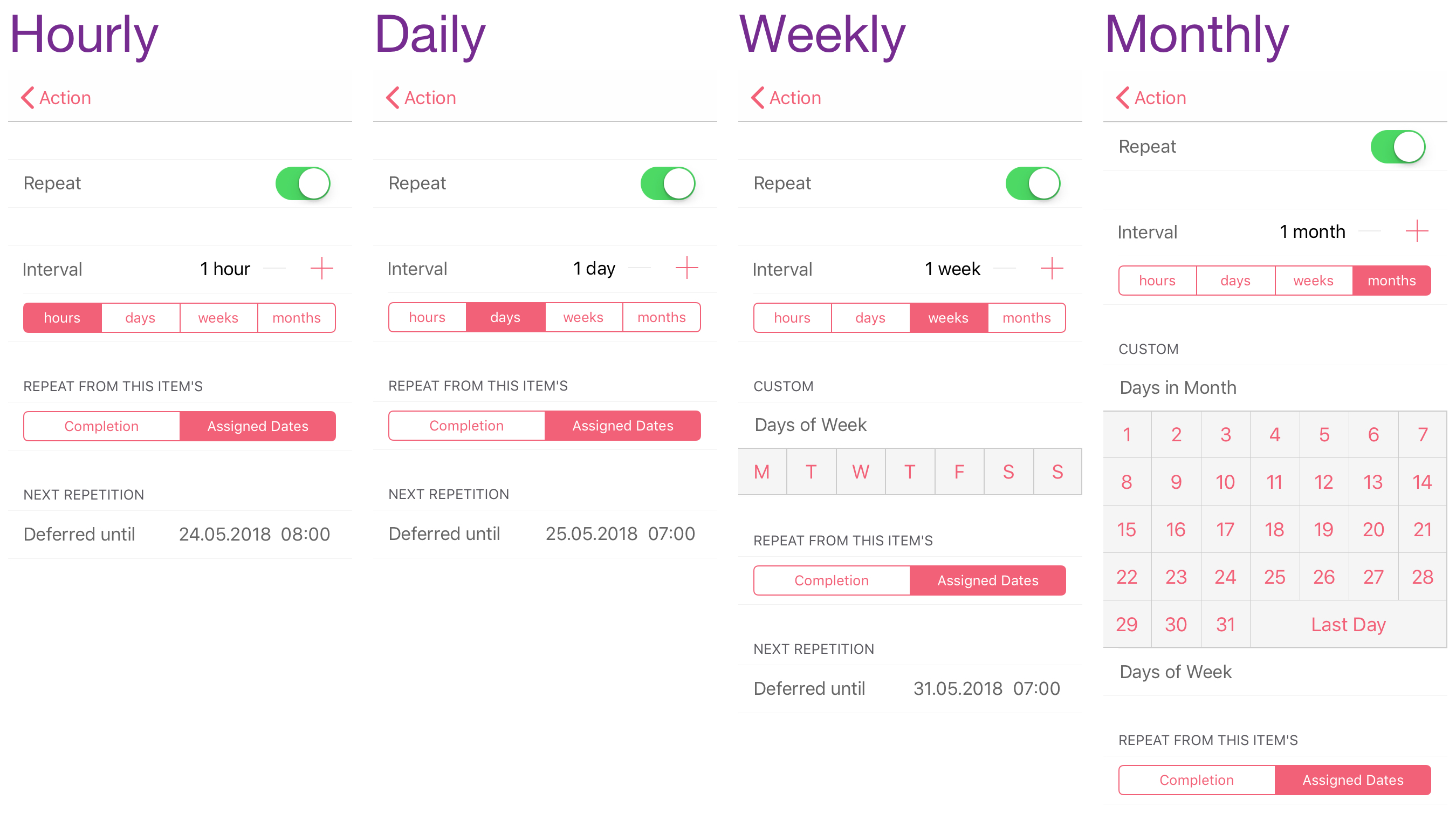 I love repeating tasks, my problem is my repeating tasks aren't all that regular (at least most of them), thankfully I can handle this in OmniFocus 3. You can set repeats with an hourly, daily, weekly or monthly interval, but you can also say "every Tuesday and Saturday", or "the first Wednesday of every month", or "the last day of every month". This has made submitting my work timesheets much easier to remember.